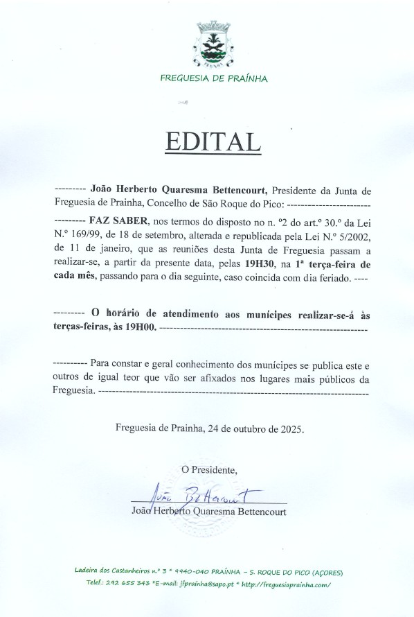 A partir de 2 de janeiro, está aberta a consulta pública sobre o projeto de Regulamento do Cemitério de Prainha, até ao dia 31 de janeiro de 2025. Até ao termo deste prazo, poderão os interessados formular as suas observações, sugestões ou contri